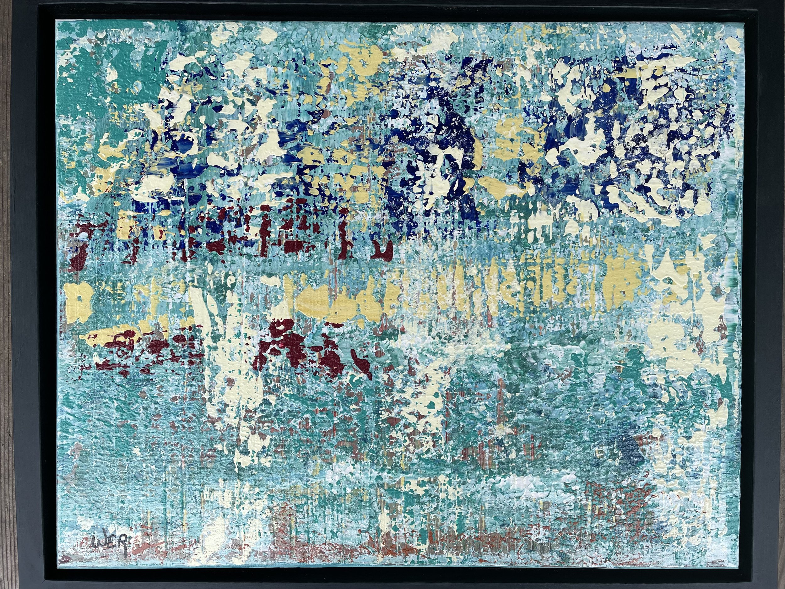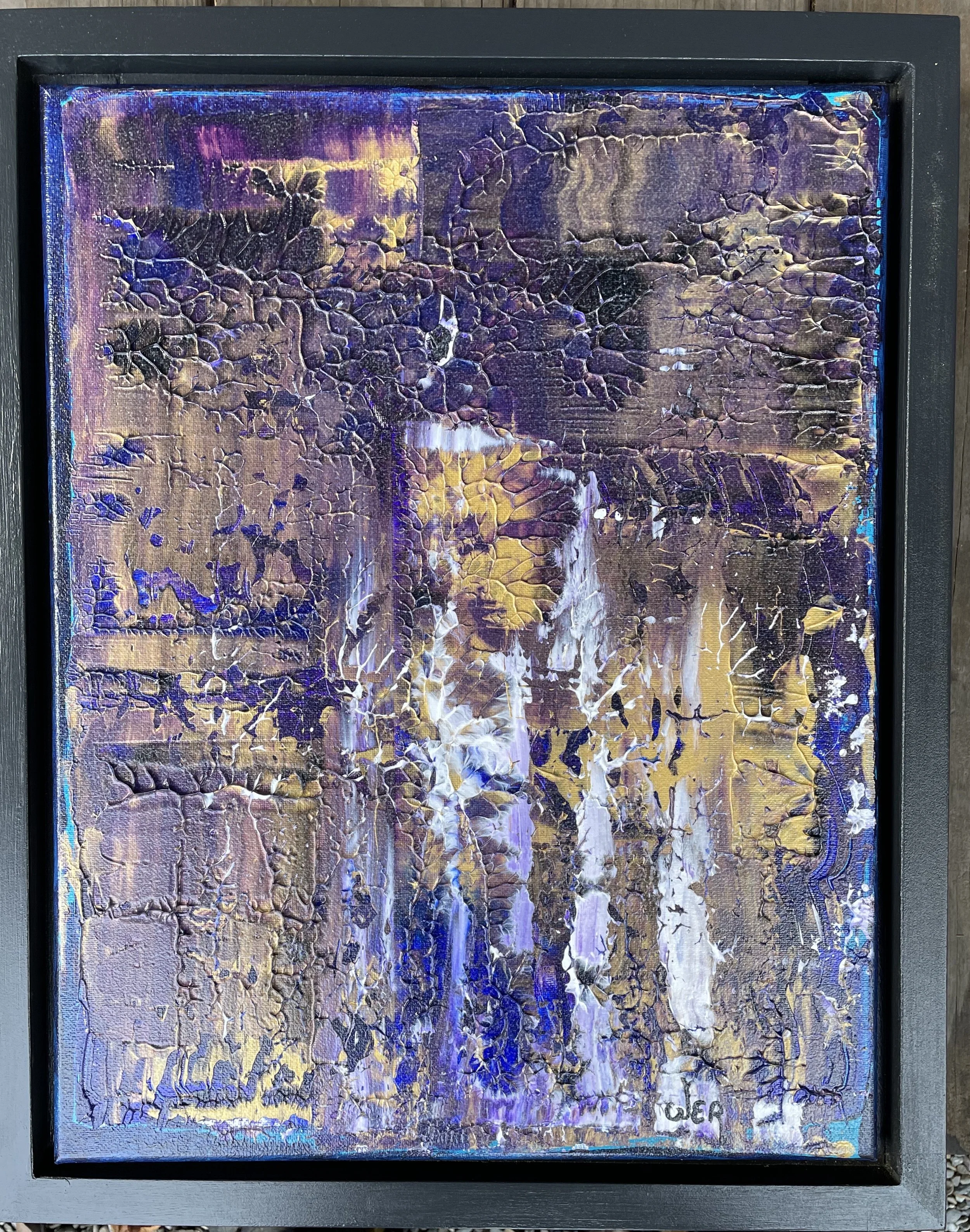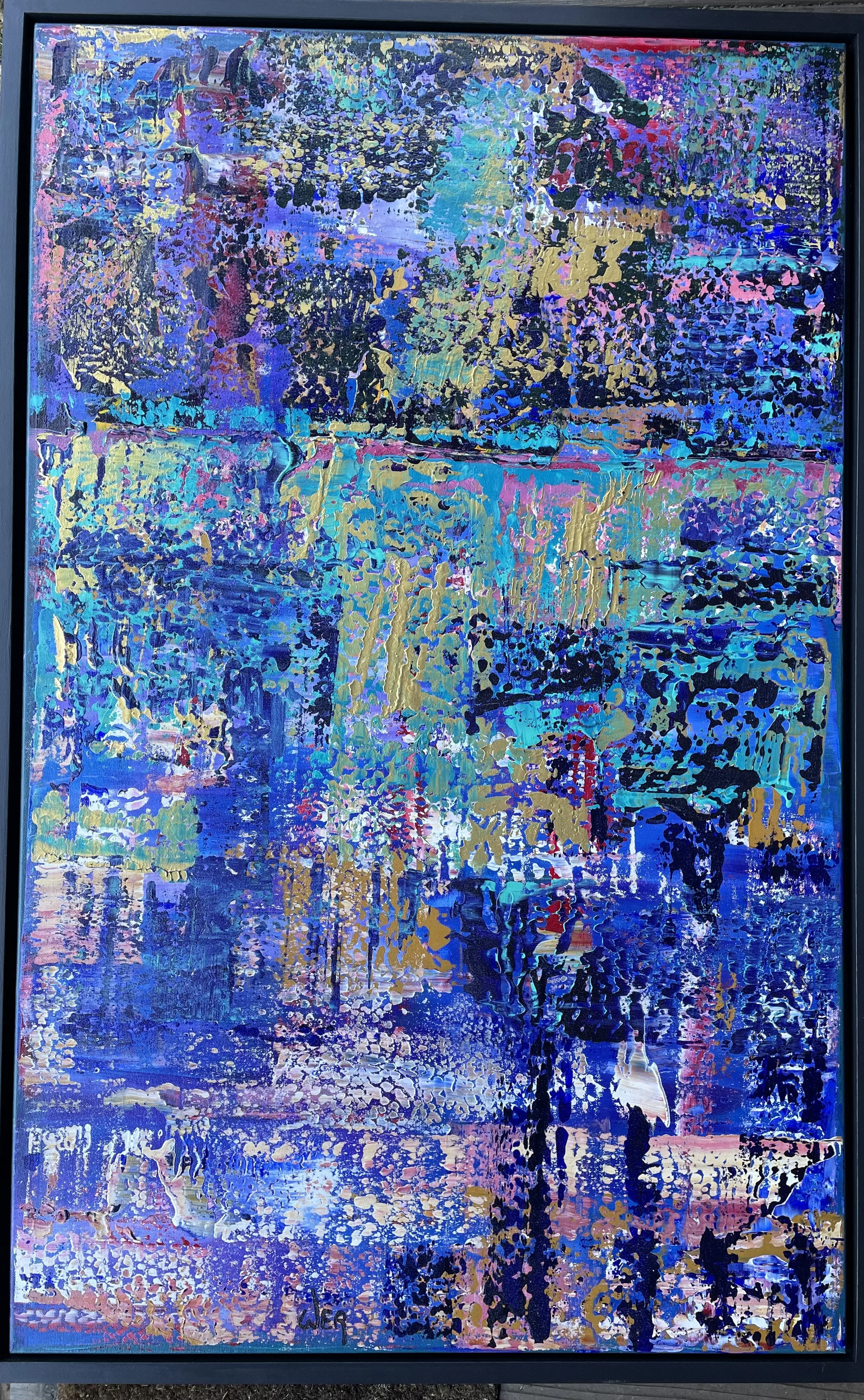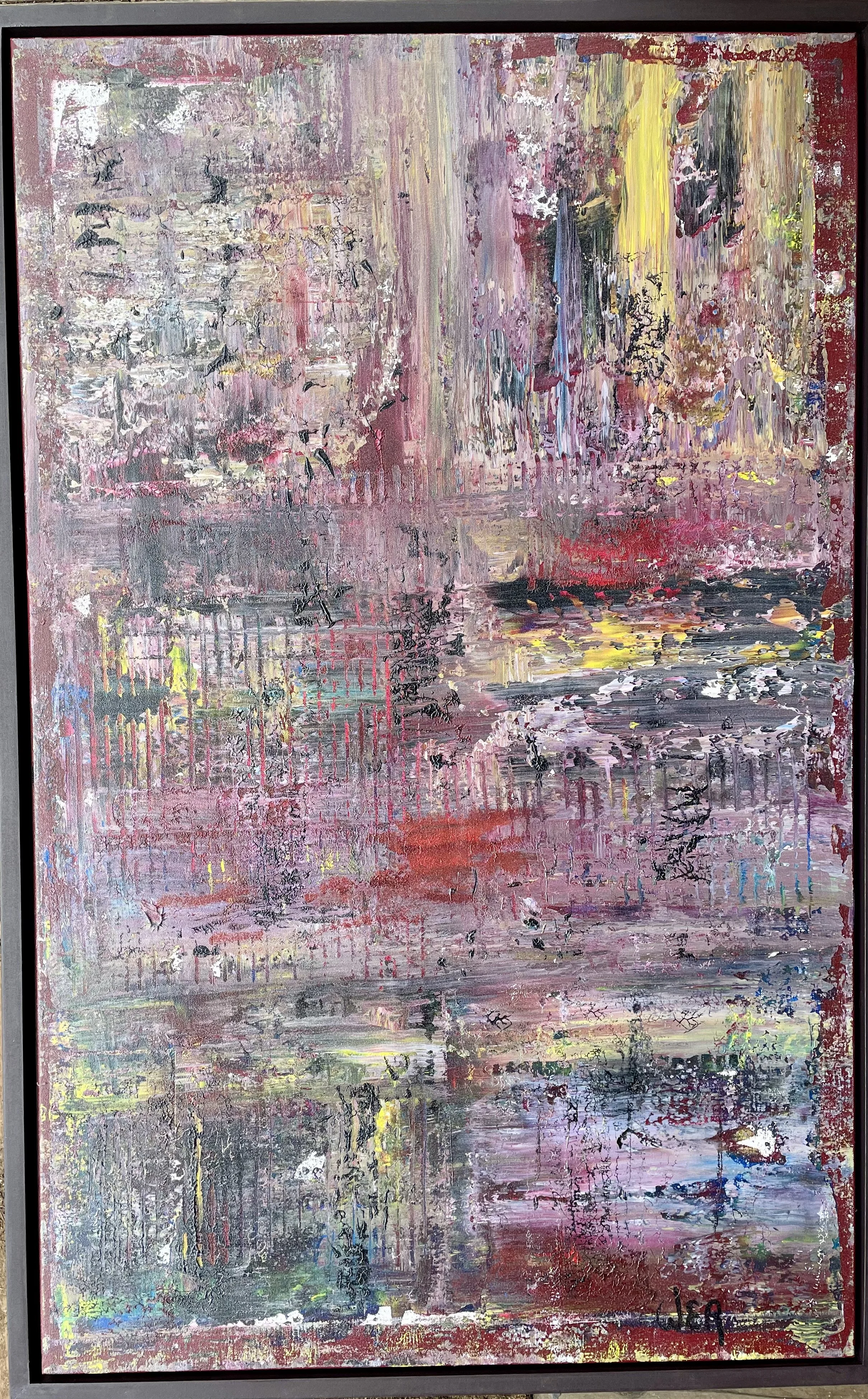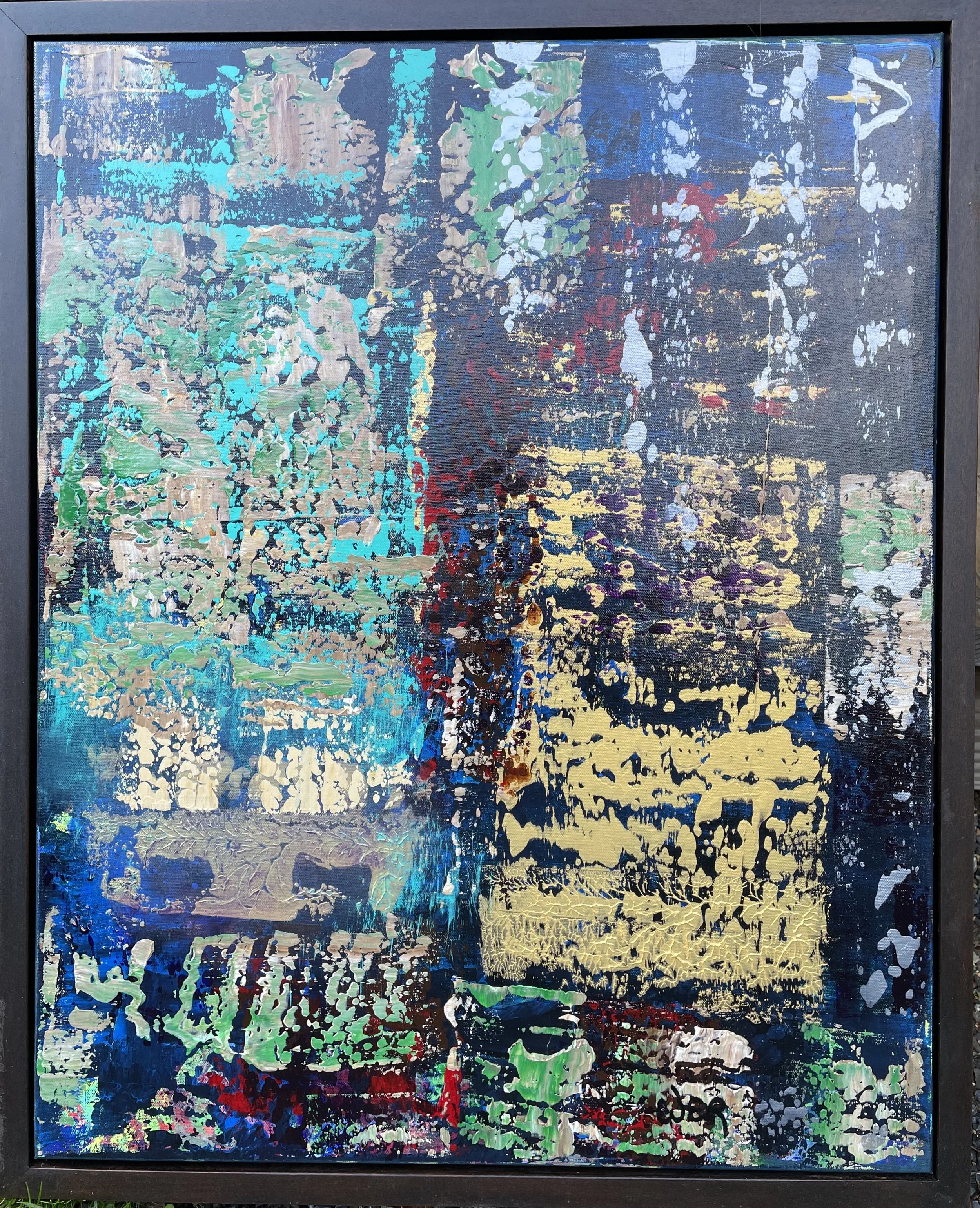 I approach each canvas as a journey, as an adventure. The painting process is unplanned. Starting with some harmonious colors I trowel and sponge, scrape and brush until a coherent theme emerges. Ideas are pursued, often to quick effect, sometimes to be covered over completely as the picture changes direction. The finish can come suddenly, or take months, as did #24.